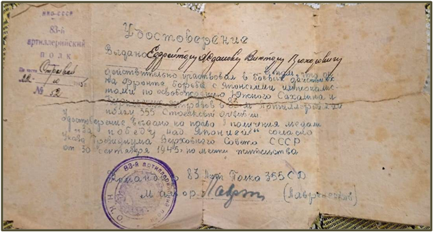 Призван на фронт в ноябре 1939 года Ойротским военкоматом. Воевал на Дальневосточном фронте в составе 355 стрелковой дивизии, 83 артиллерийского полка, имел специальность артиллерист-вычислитель. Демобилизован в декабре 1945 г.