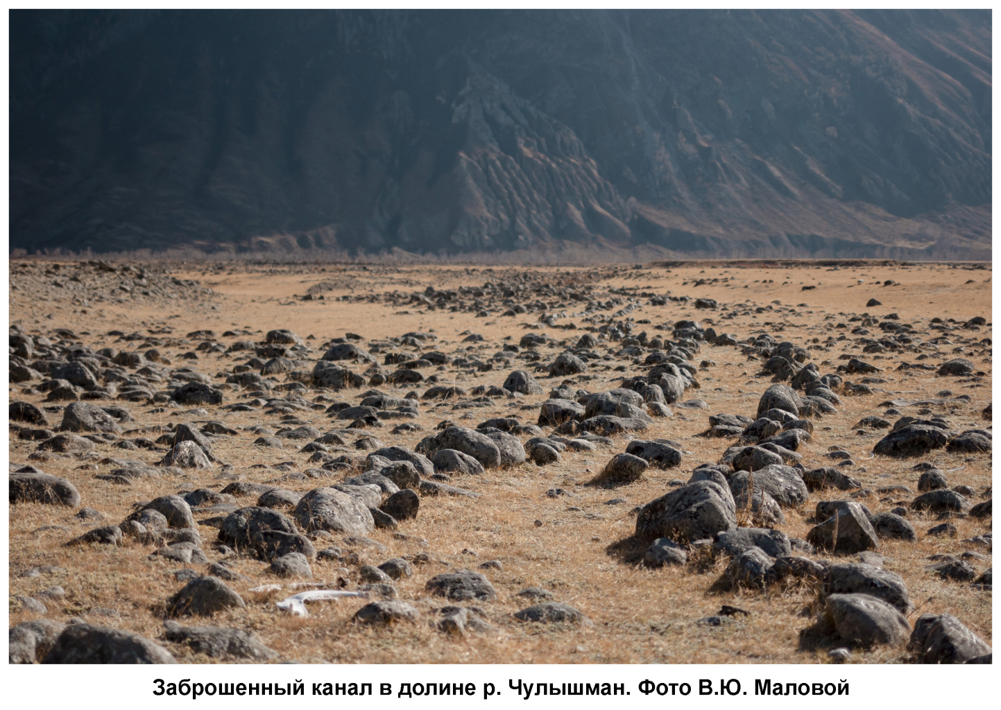 Систематизация данных о каналах показала, что существует две группы памятников ирригации. Об этом, кстати говоря, писал еще в самом начале XX века известный исследователь С.П. Швецов, обративший свое внимание на традиционное земледелие алтайцев. Одна группа имеет условно простое устройство и представляет длинный канал, который подводил воду к нескольким небольшим полям. Такие простейшие оросительные системы были проложены первыми земледельцами, время появления которых на Алтае остается дискуссионным вопросом. Вторая группа памятников имеет более сложную систему орошения. К ним можно отнести некоторые комплексы ирригации в долине р. Чуя у с. Чибит, в долине реки Чулышман в районе устья р. Чульча, в западной части Курайской котловины, а также некоторые оросительные системы в Центральном Алтае. Судя по всему, это были крупные центры земледелия, которые могли существовать здесь в эпоху Средневековья. Именно на этот период происходит расцвет земледелия у населения Алтая.