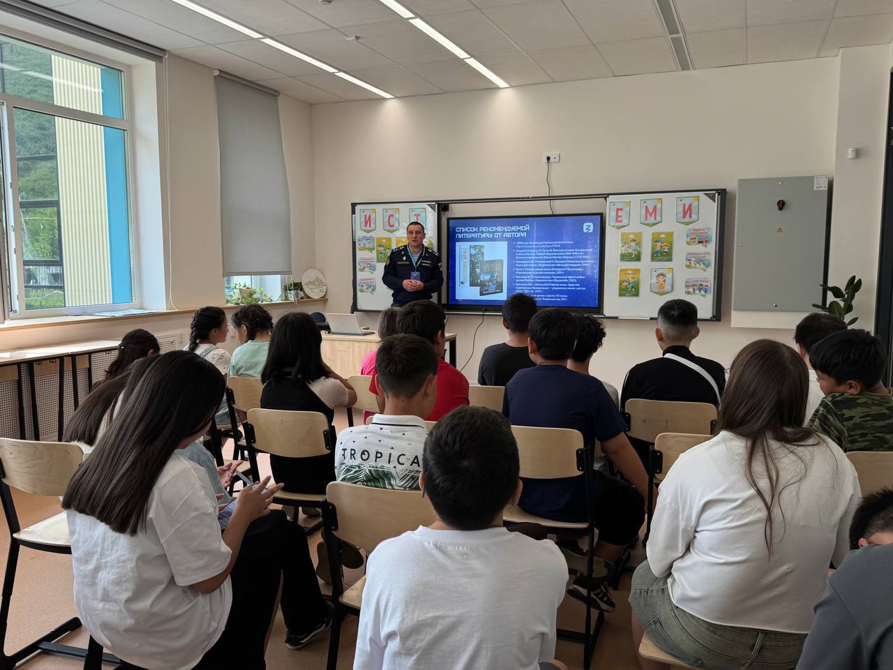 Лектор Общества «Знание», ветеран боевых действий, начальник Военного учебного центра ГАГУ Сергей Черданцев провел патриотически встречи для отдыхающих пришкольного лагеря школы № 7 г. Горно-Алтайска. Слушатели узнали о великих полководцах, историю русской армии, а также кто сегодня защищает страну в зоне специальной военной операции.