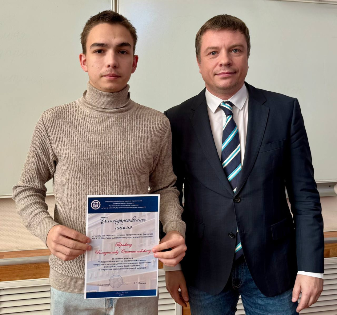 Благодарственные письма Горно-Алтайского государственного университета за активное участие в V Всероссийском научно-практическом семинаре «Народная игра как средство этнокультурного воспитания» вручены Алине Айдаровне Самеговой, Владиславу Станиславовичу Травину, студентам ГАГУ.