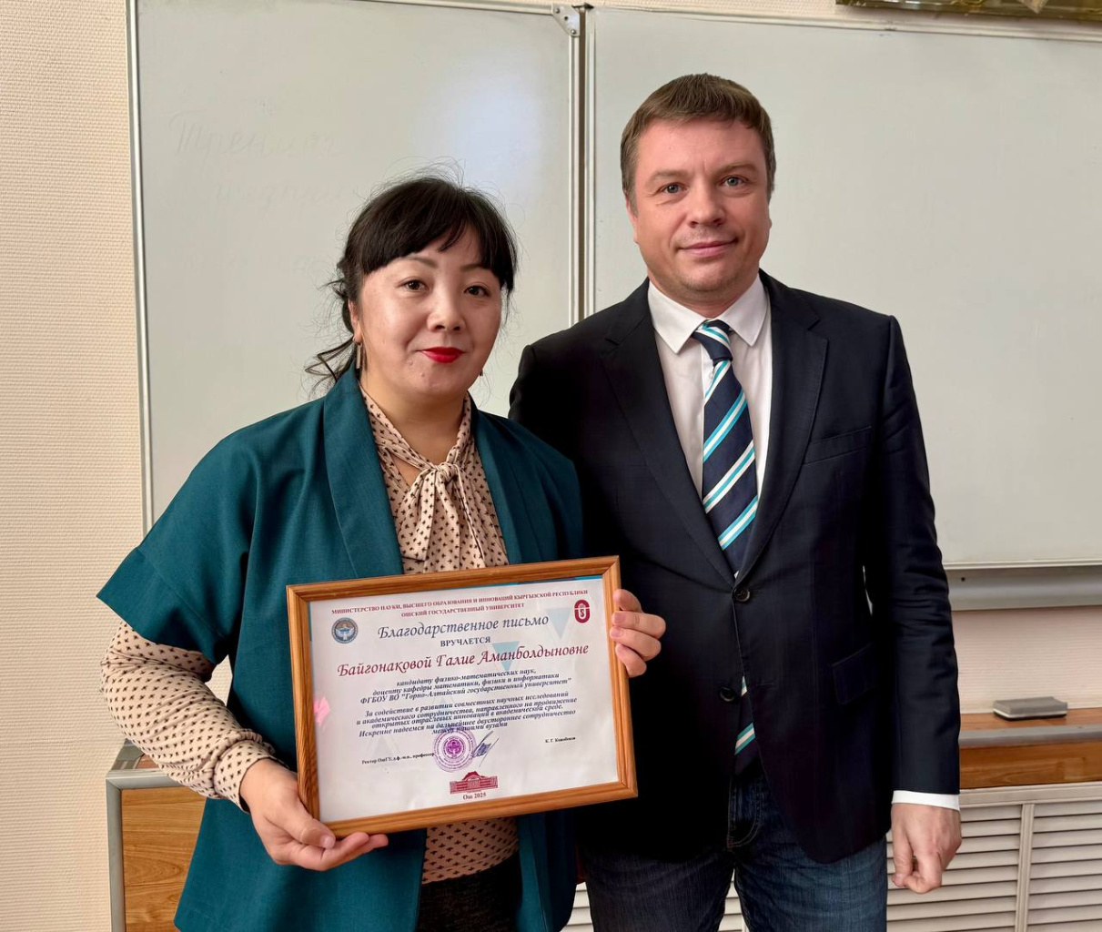 Благодарственное письмо Ошского государственного университета за содействие в развитии совместных научных исследований и академического сотрудничества, направленного на продвижение открытых отраслевых инноваций в академической среде, вручено Галие Аманболдыновне Байгонаковой, доценту кафедры математики, физики и информатики ГАГУ.